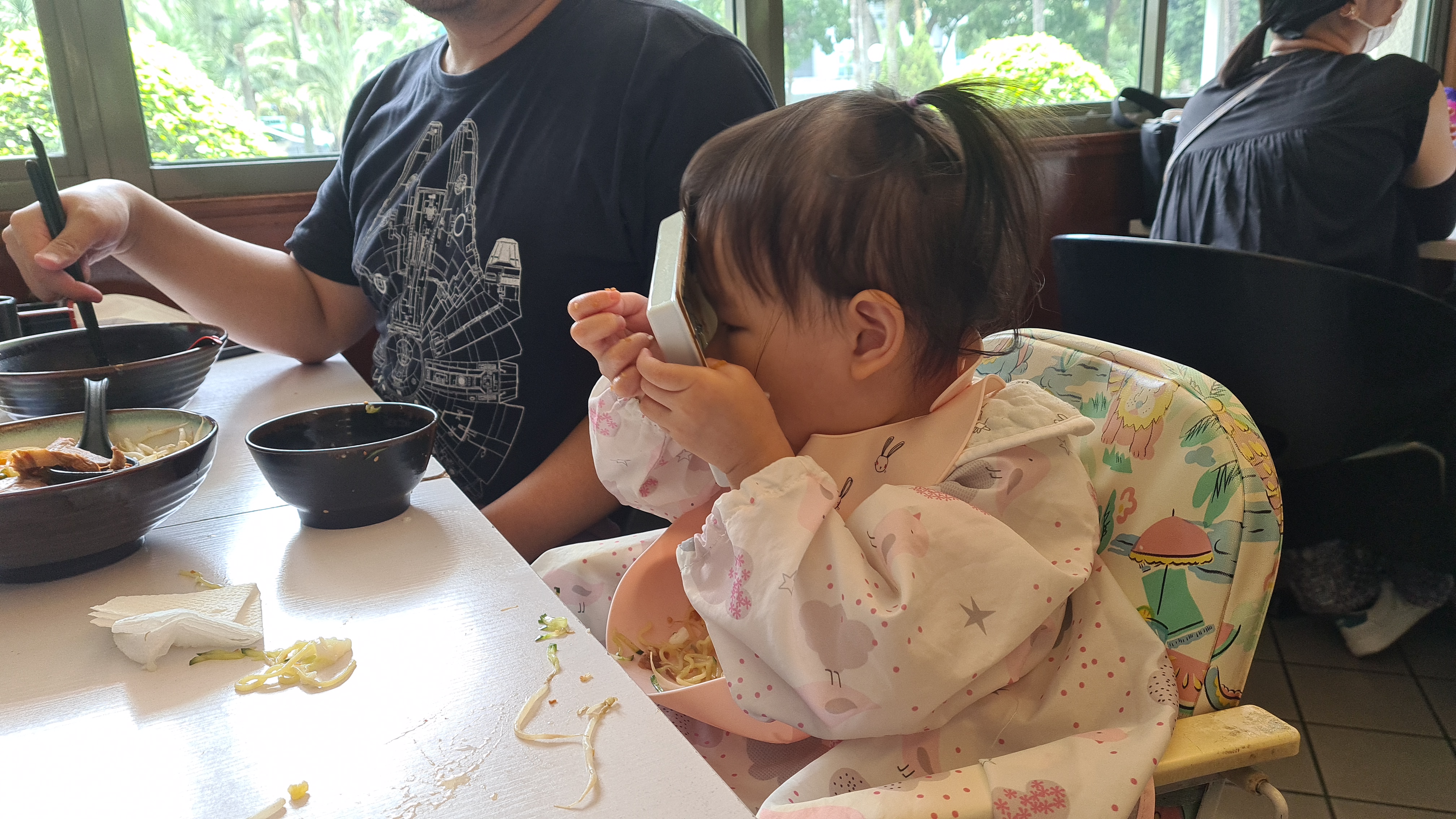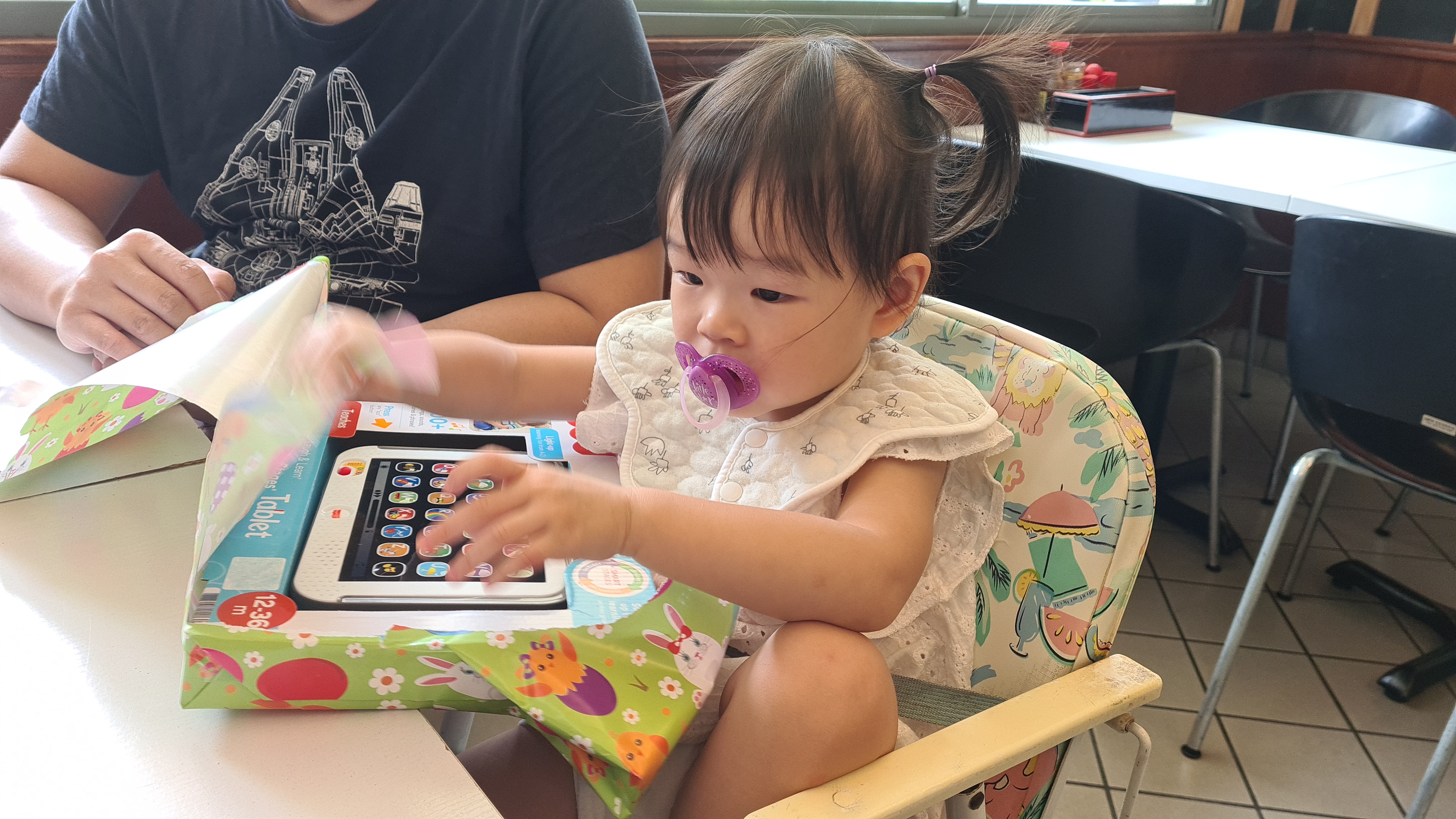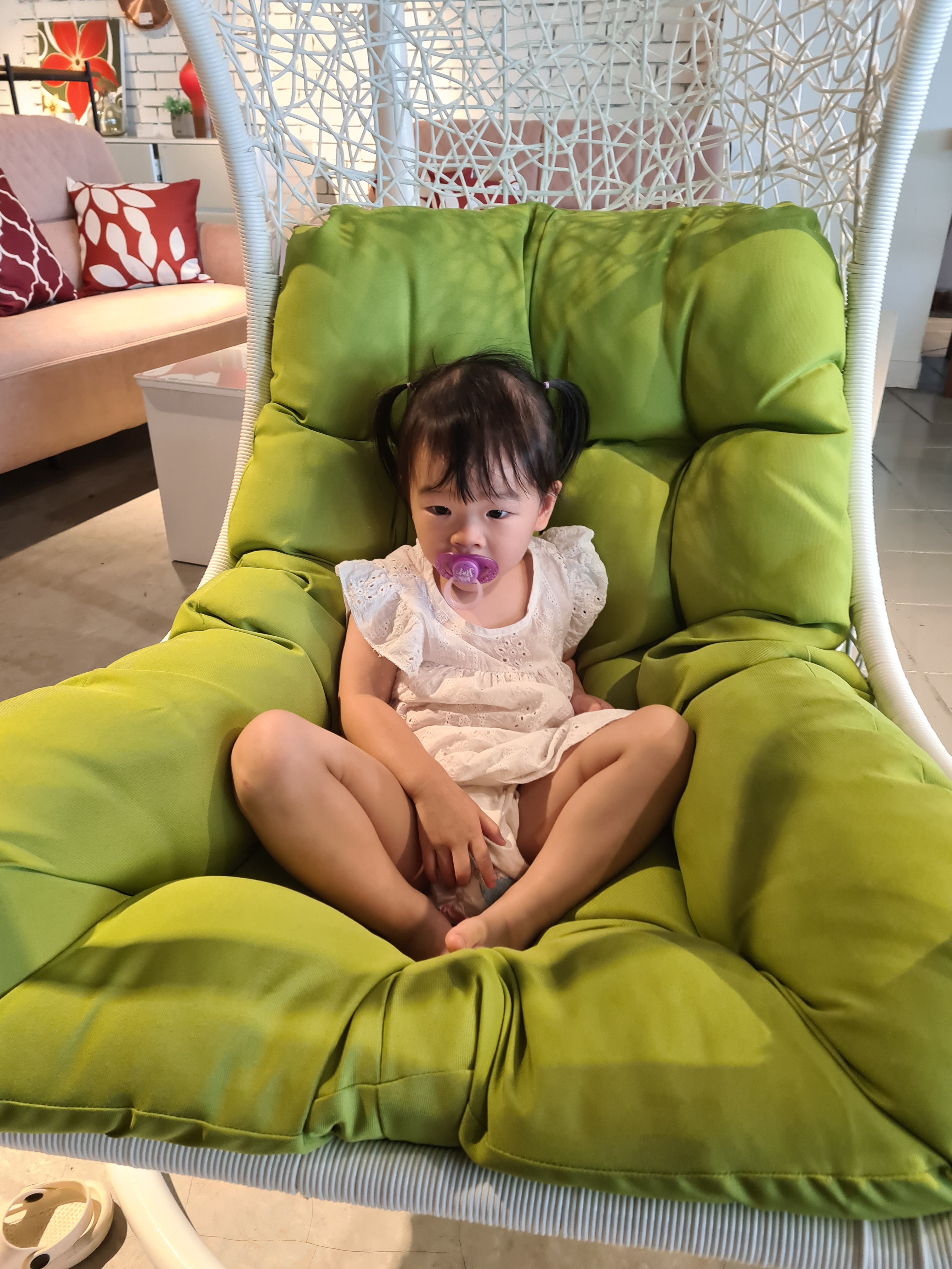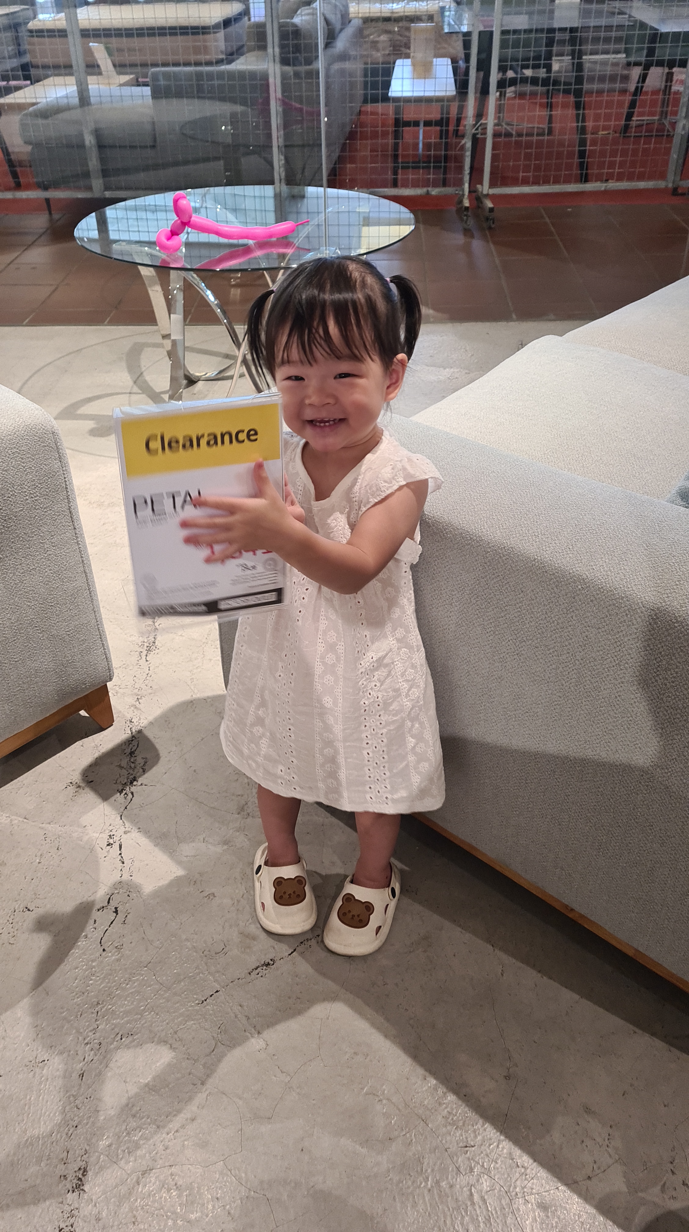 Yesterday Rei received a toy from Uncle Javen. Her first ever Fisher Price’s product. It’s an alphabet tablet where you can press the buttons to listen and interact. We had lunch at a Japanese restaurant and Rei licked a plate clean. After that, we went to Citta Mall to look at furniture with Aunty Hsinnie. So happened there was a family day programme going on so Rei received her first animal balloon which was a dog. She bit the balloon later on and it burst. She didn’t cry. Rei also went to a small bouncy house but came out soon after. At the furniture shop, she loves the hanging wooden hammock chair. Yang bought a berries drink and after adding some water to the remaining, Rei finished the whole cup!
